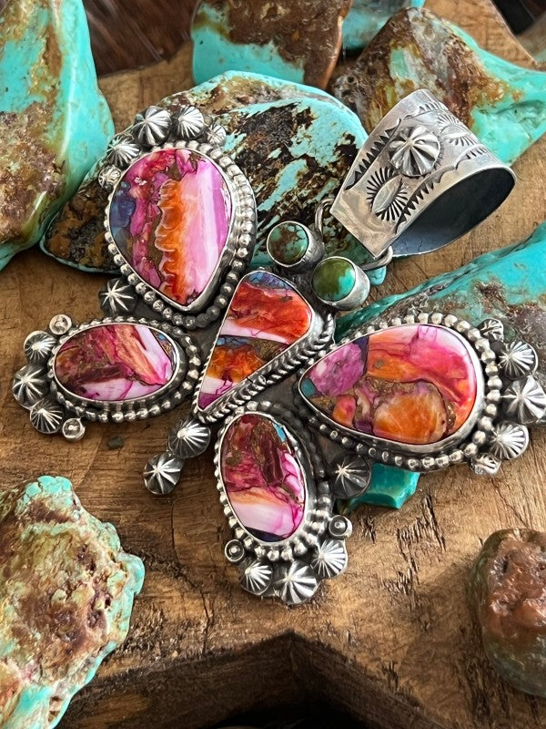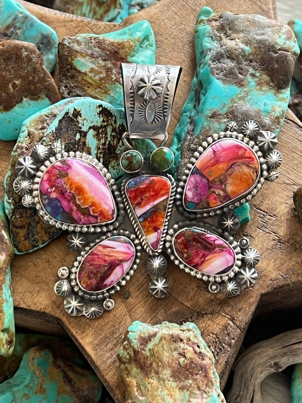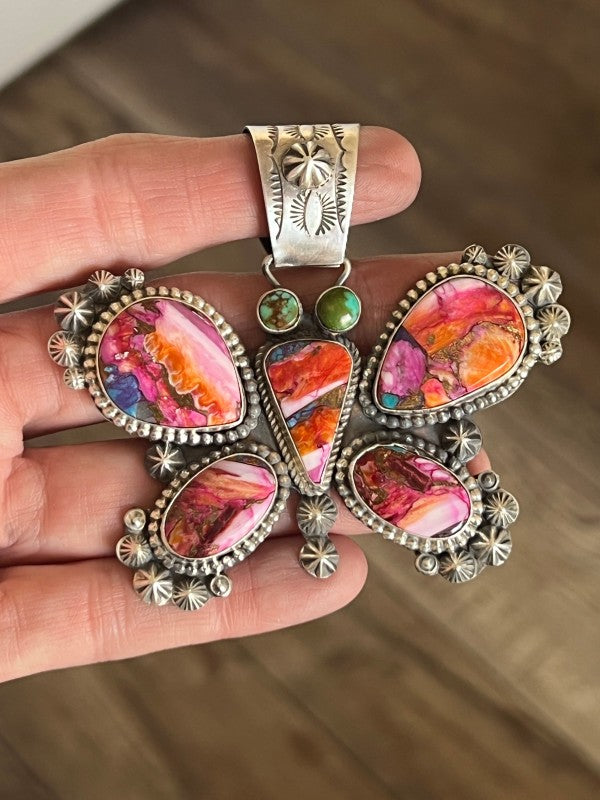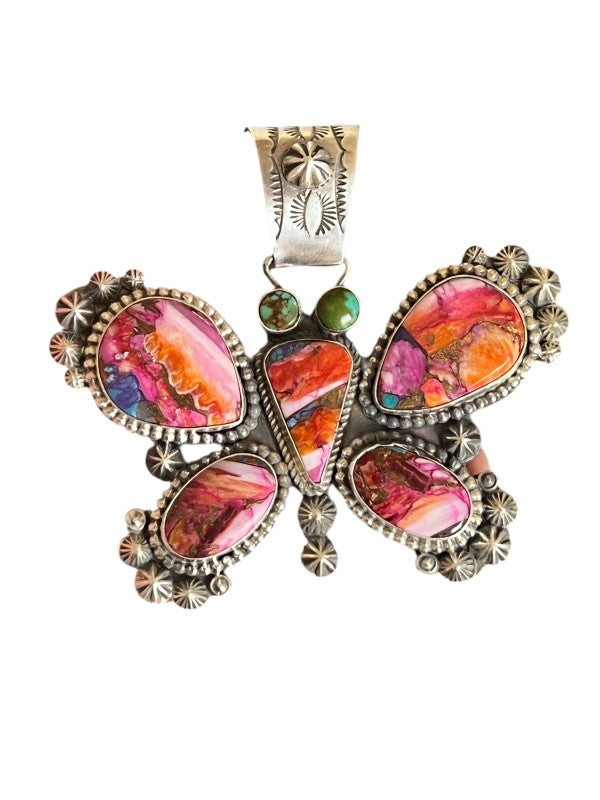 This stunning sterling silver butterfly pendant made by Apache silversmith, Rosella Paxson, features vibrant pink dream mohave (made at the Kingman Turquoise mine) with Hubei turquoise accents. The wings are bordered with sterling bead wire and fanciful shot which adds to the beauty of the entire piece. The pendant is topped off with a 16mm hand stamped bail. Altogether it measures 2-7/8 inches x 3-1/4 inches.