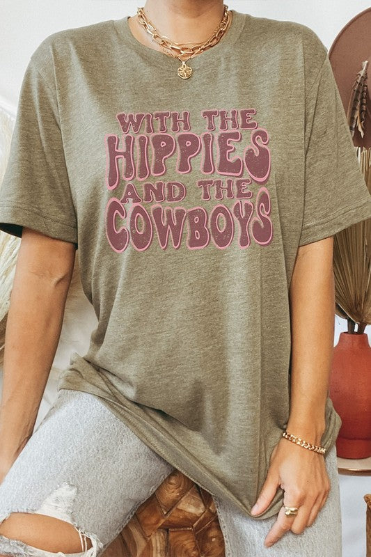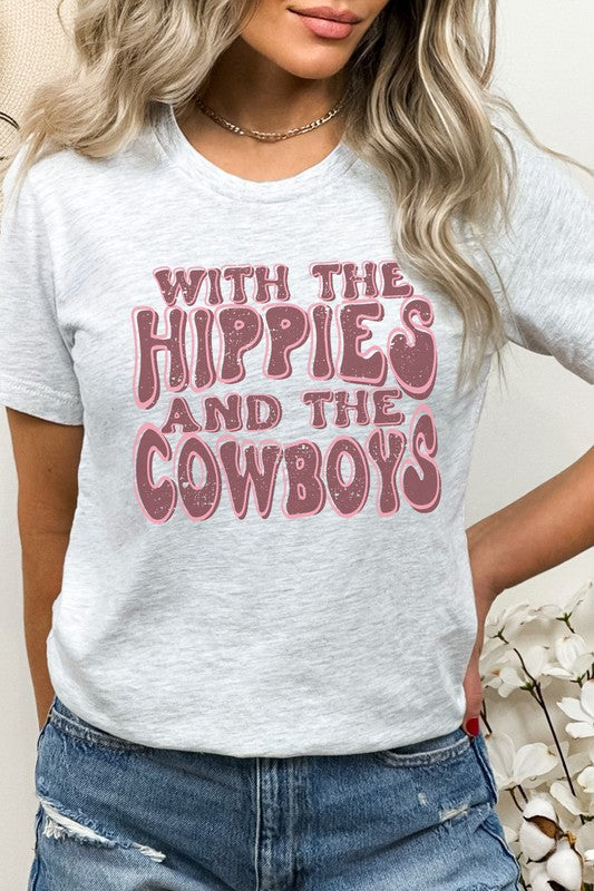 Channel your inner free spirit with our 'With The Hippies And The Cowboys' PLUS SIZE Graphic Tee By Kissed Apparel.This vintage-inspired tee combines the bohemian essence of hippies with the rugged spirit of cowboys, creating a unique and stylish design. Most t shirt colors are 52/48 cotton/poly. White and Cream tees are 100% cotton, Ash tees are 99/1 cotton/poly. Embrace your wild side and make a statement with this eclectic graphic tee.Pair this top with your favorite pair of denim jeans!